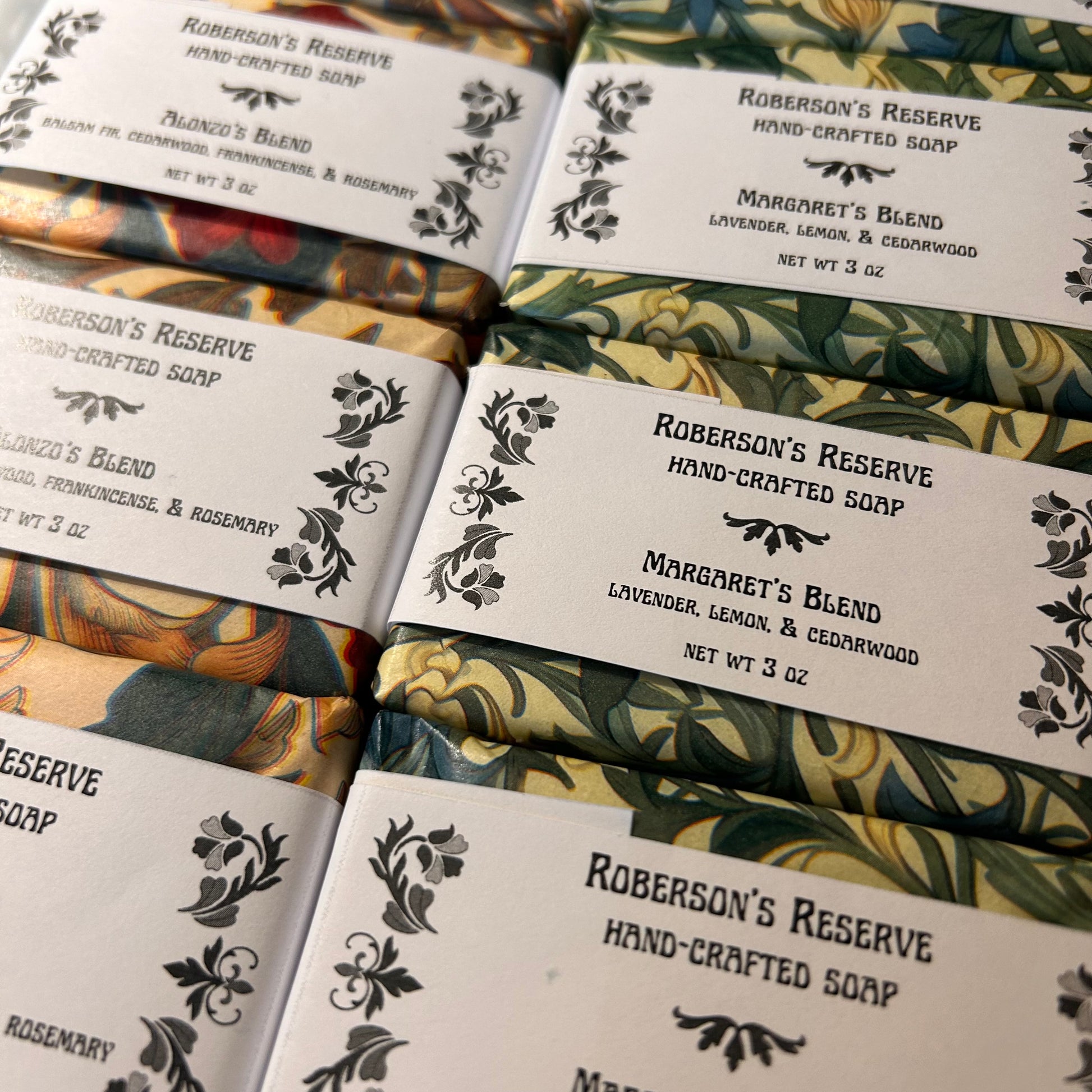 This blend is bright and sensible, featuring lavender, lemon, and cedarwood. The calendula flower infusion imparts a pale yellow color throughout the bar. Margaret Roberson was a school teacher in Binghamton, NY during the late 1800s. She and her husband Alonzo moved into the Roberson Mansion home in 1907. This unique soap is packaged in beautiful paper wrapping designed in an Art Nouveau style. Pair this gem with a bar of Alonzo's Blend for the perfect companion. Available exclusively at the Roberson Museum gift shop, it's like taking a piece of history home!